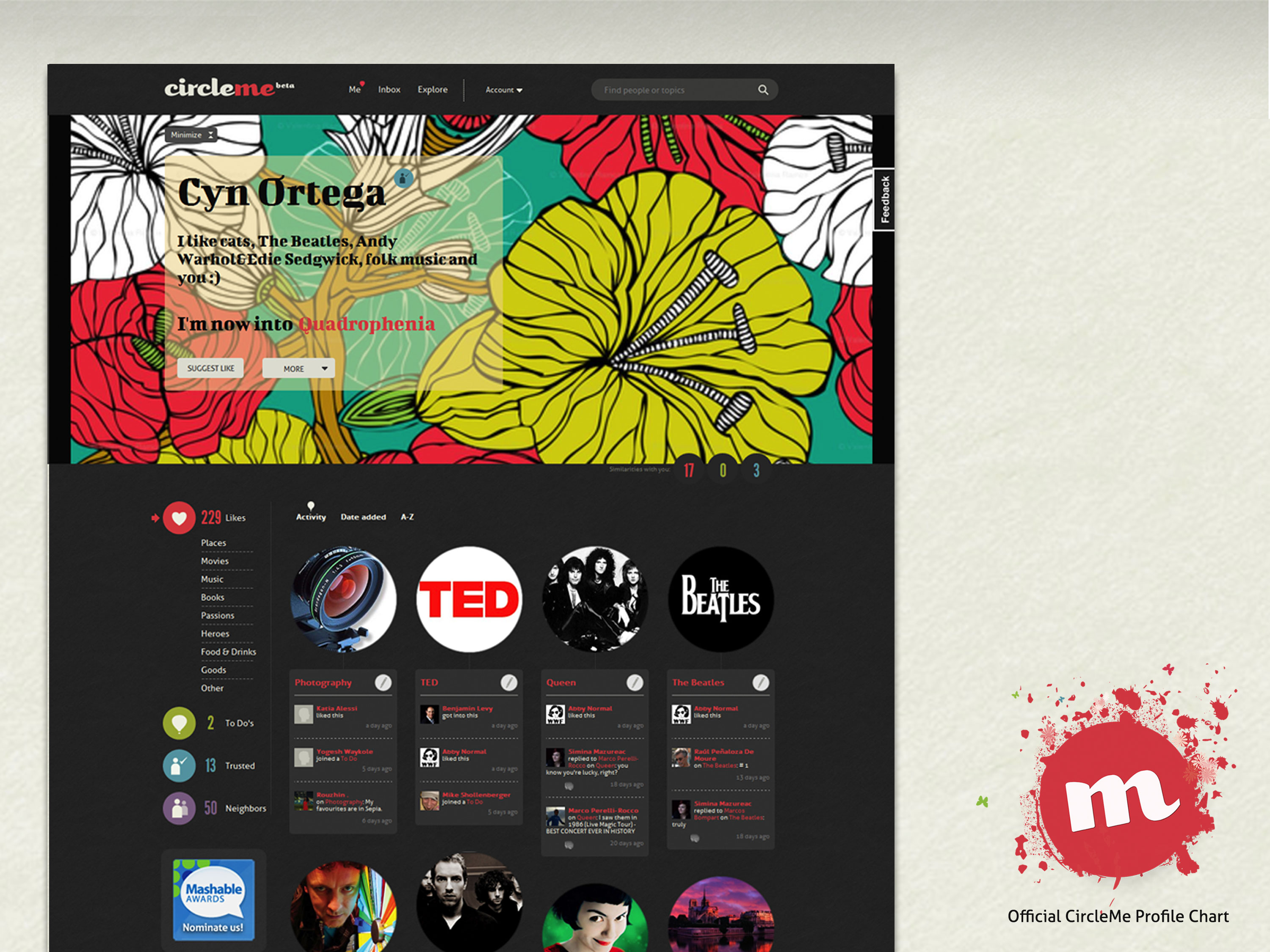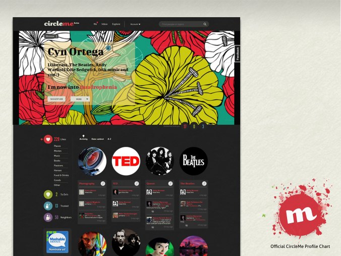 5th winner: Cyn Ortega, from Mexico! November 25, 2011August 13, 2012 / CircleMe Team Congratulations! Here we have our 5th winner of our Official CircleMe Profile Chart, Cyn Ortega. “I like cats, The Beatles, Andy Warhol&Edie Sedgwick, folk music and you 🙂 ” and she gain the votes to become the coolest CircleMe’r of the week! Share this: Click to share on Facebook (Opens in new window) Facebook Click to share on X (Opens in new window) X Like Loading... Related