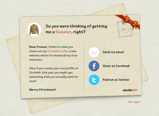 But we know that it can be rather tough to get friends to join us on cool new sites, so we have thought of a quirky way to invite your friends and family to join you on CircleMe: A “Special” Christmas Card: With this “Special” Christmas card you can ask them to… well, not to give you the same old Christmas gift! You could also send them a card asking them to sign up on CircleMe so that they don’t receive the same old Christmas gift you dread making.