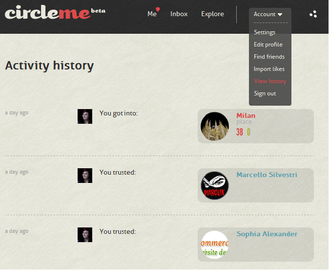 Starting from today you can enjoy your own activity history: Wouldn’t it be cool if you were able to track your activity on CircleMe? Yes, we mean every single activity including adding a like or to do, sharing or voting a story, trusting someone… Everything summarised on one page! You can find this new feature clicking on the Account Button on the CircleMe Navigation Bar as seen in the screenshot below: