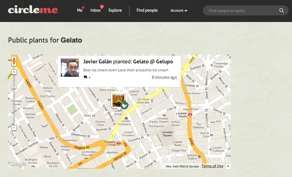 On CircleMe you can collect all the things you like and discover new ones. So, we thought that it would be very cool if you could add one of your Likes not just on your profile, but also somewhere in the world. For instance, you might discover the best ice cream ever and want to add it as a Like, but not only on your profile: What about placing the like somewhere in the world? What about placing it where that awesome ice-cream parlor is? And so we decided to create “Plants”: The possibility to place things you like somewhere on the map.
