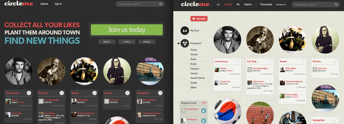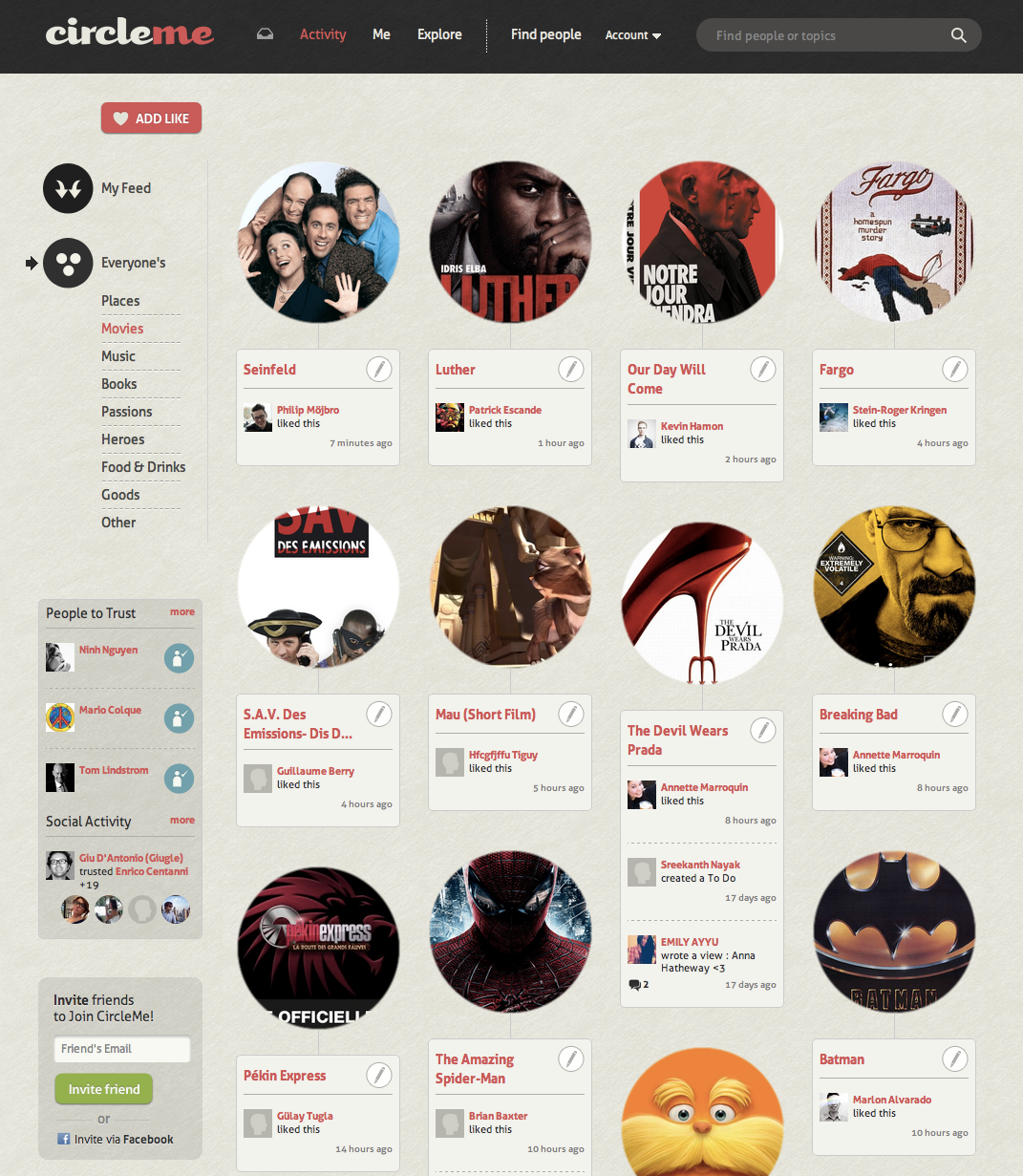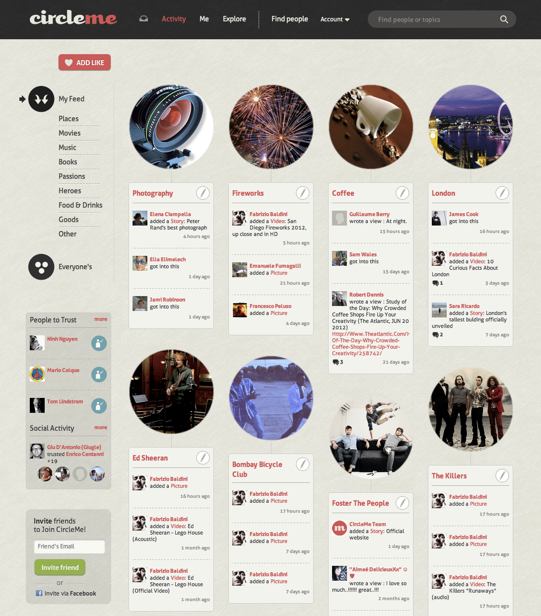 The new activity page makes it easier than ever for you to discover new likes and users on the site. Now we show you a cascade of interesting content, meaning that CircleMe looks better than ever. We also group activity stories together under each item, meaning that the site is easier to read than ever before, and you can now choose the category of the items for which you want to follow the activity.