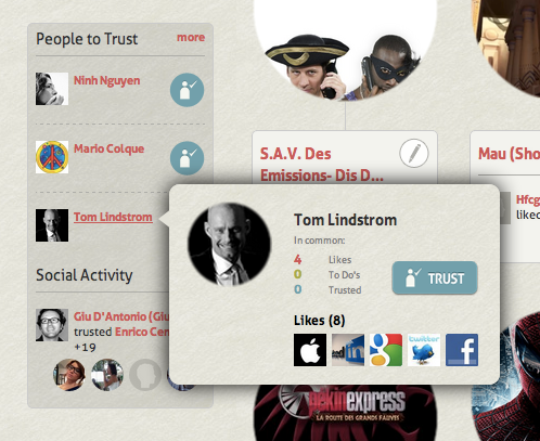 Another great new feature is this new box to the left of the activity page. We now show you some users you might want to trust, along with who your existing friends are trusting. This makes it really easy to find interesting new users on CircleMe.